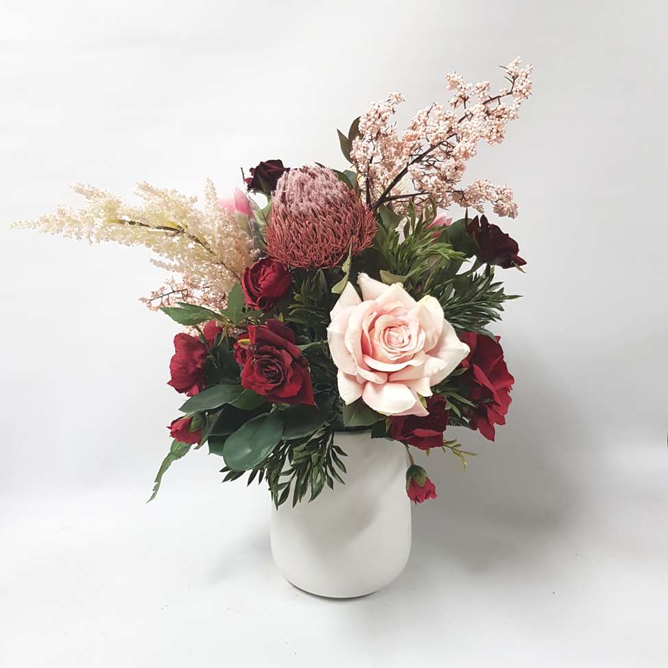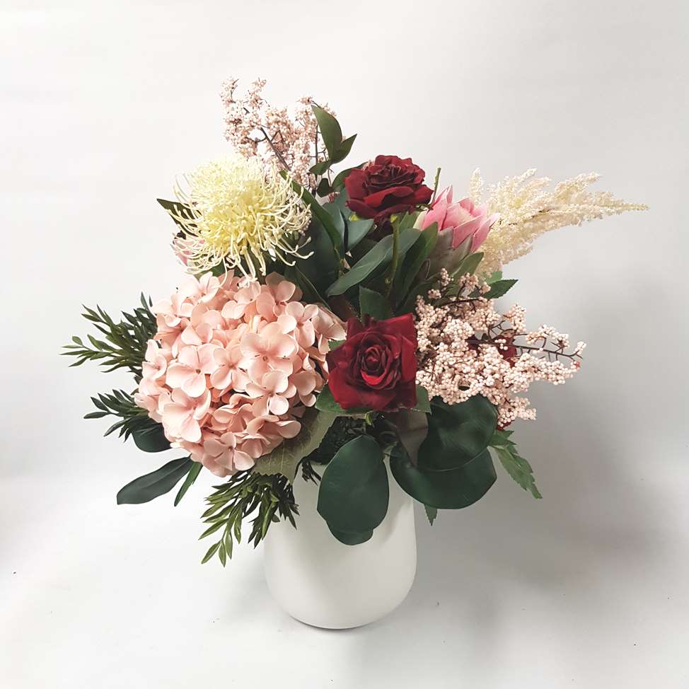 This stunning design is a modern mix with Banksia ,Roses, Protea & Hydrangea in Pink & Red Hues in a modern white ceramic vase.