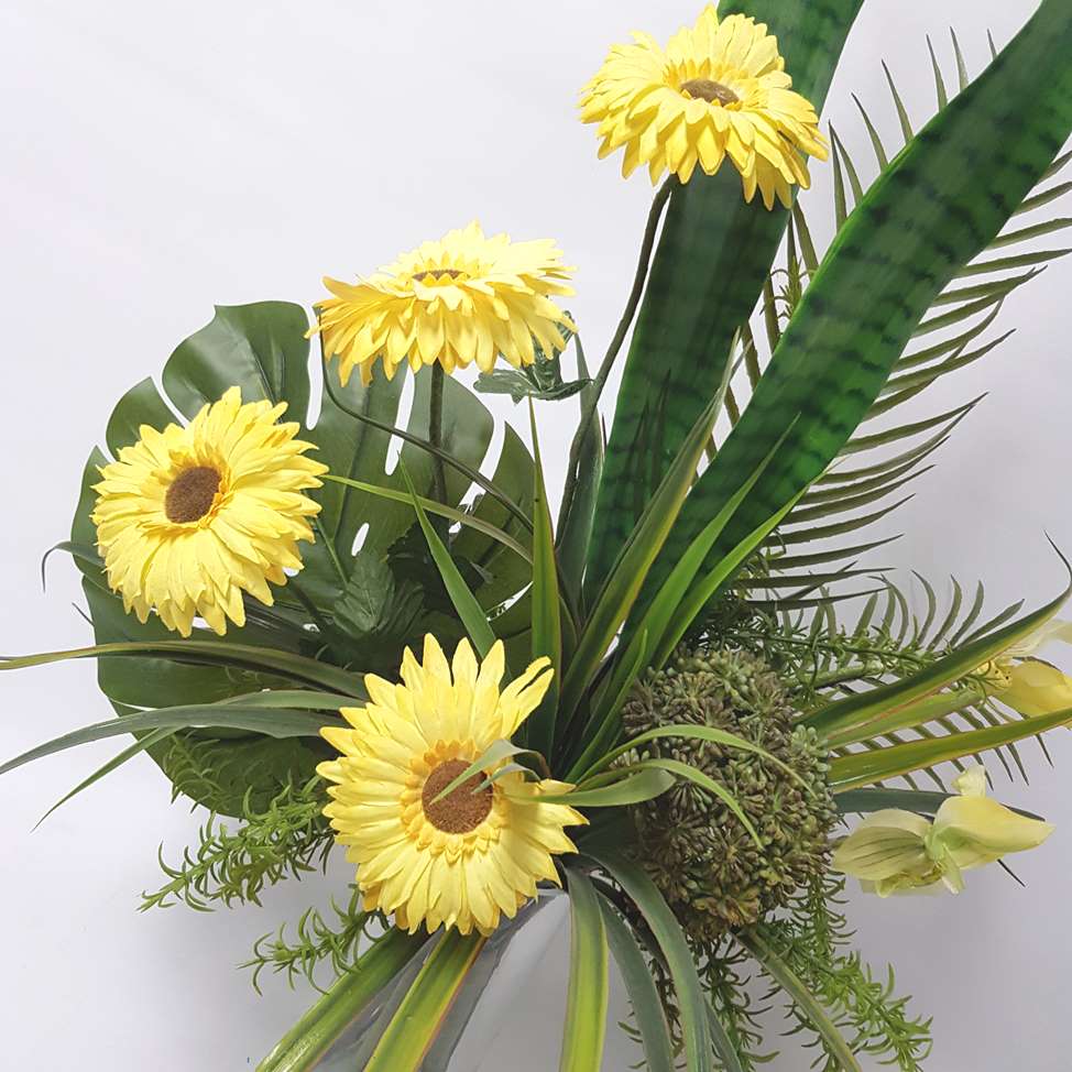 With a stunning display of Tropical Foliage and Yellow Gerberas.