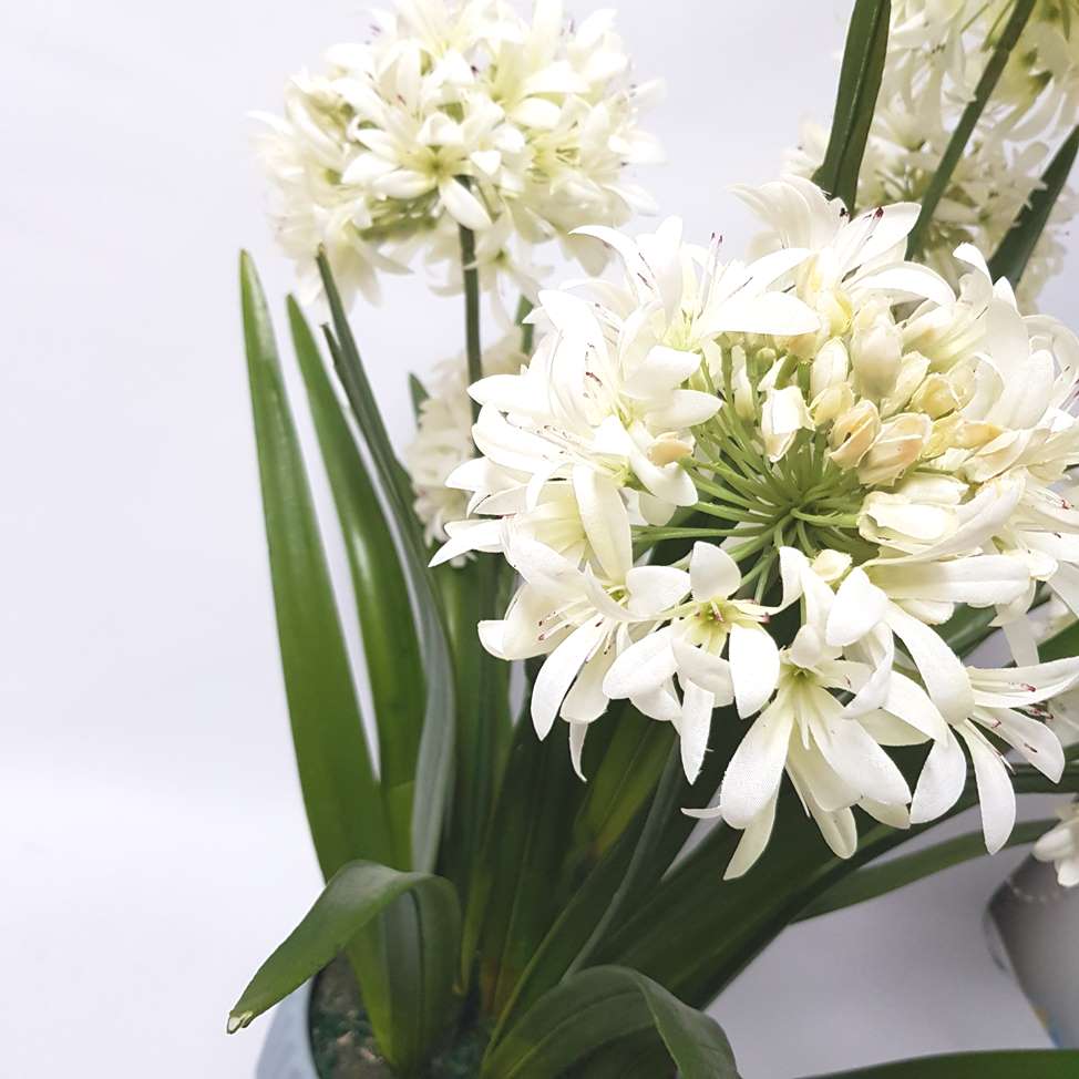 A large 360 degree crisp white agapanthus arrnagement in a light dusty blue coloured ceramic vase, Marceline is an absolute show stopper!