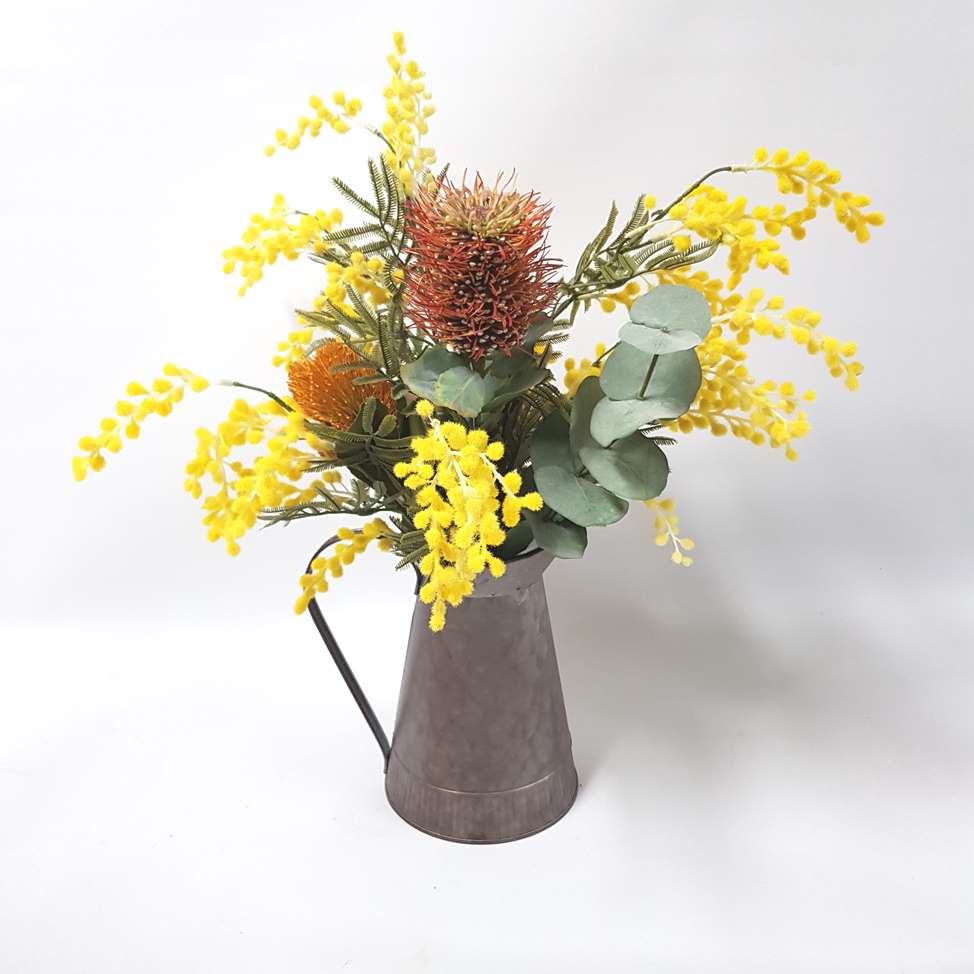 This arrangemet sports bright pops of yelow wattle with touches or rust coloured native flowers in a tin jug vase, perfect for any home or office.