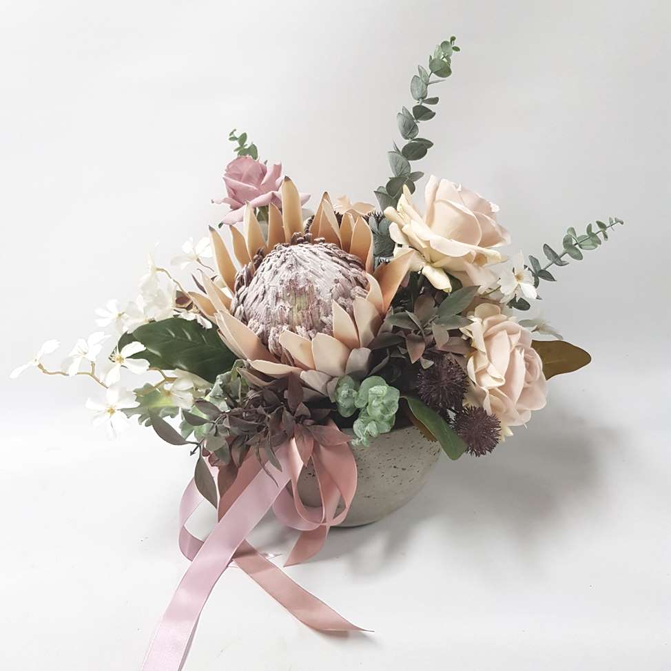This arrangemet sports a mix of qucik sand roses, a dried king protea, nude tones and purple huesase, perfect for any home or office.
