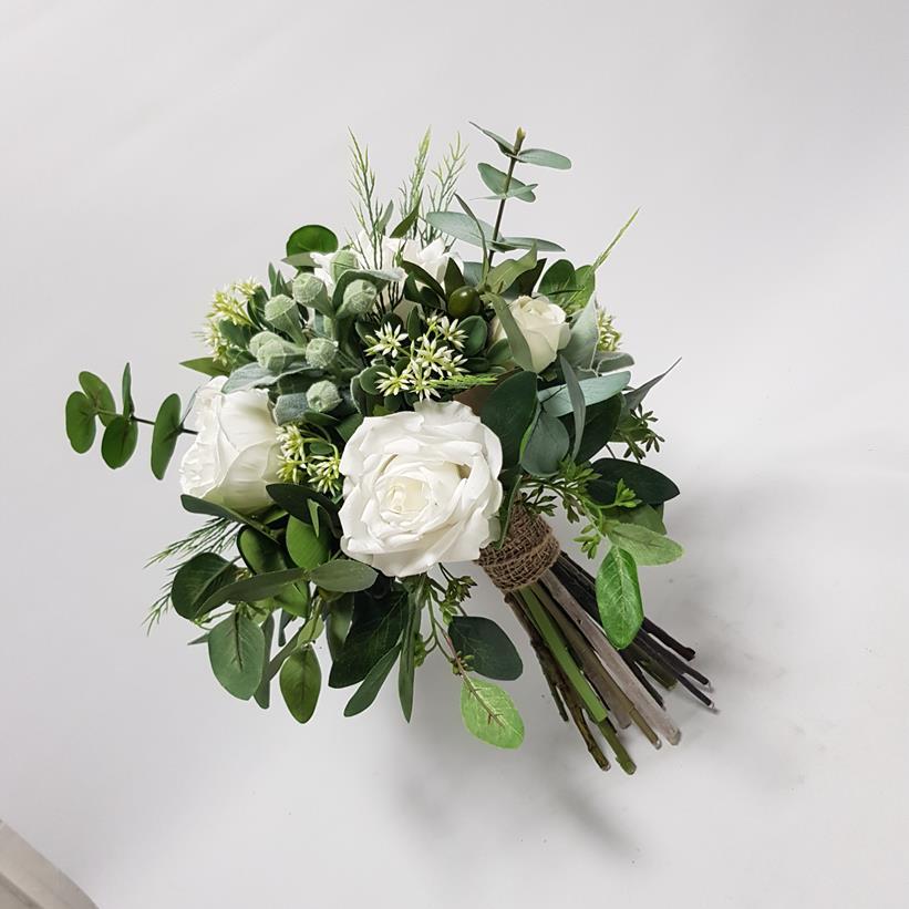 This bouquet is made up of a variety of white roses, with a mix of forest greens and dusty greens, it’s an native foliage dream!