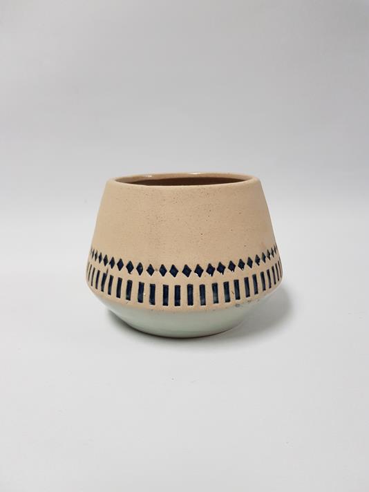A great shaped vase, this squat vase has a pale blue base and a navy blue detail pattered.