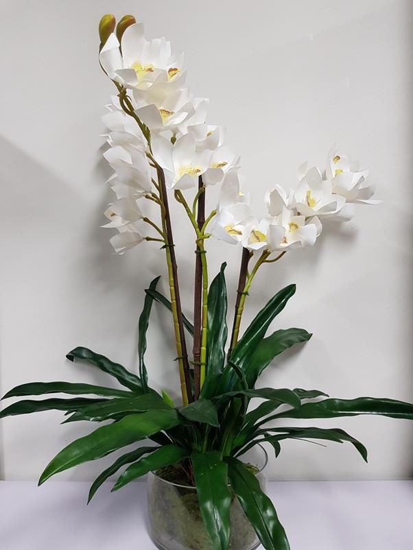 This stunning design of a white Cymbidium Orchid Plant. Presented in a elegant clear glass vase with exposed moss base.