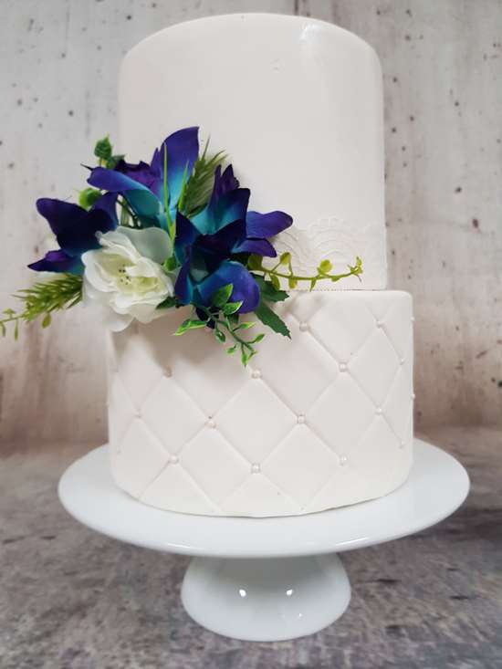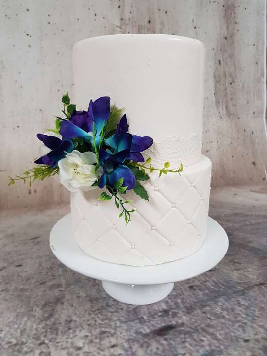 These classic mix of white garden flowers and galaxy orchids sit perfectly at the base of cakes of all sizes.