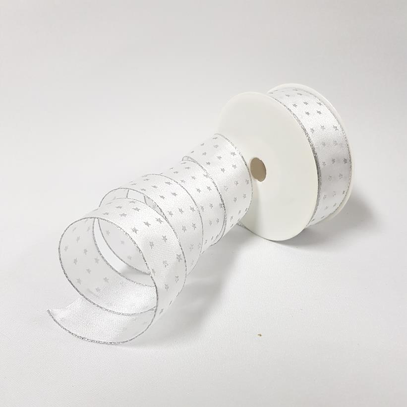 Stary Satin Ribbon Wired 25mm White Silver