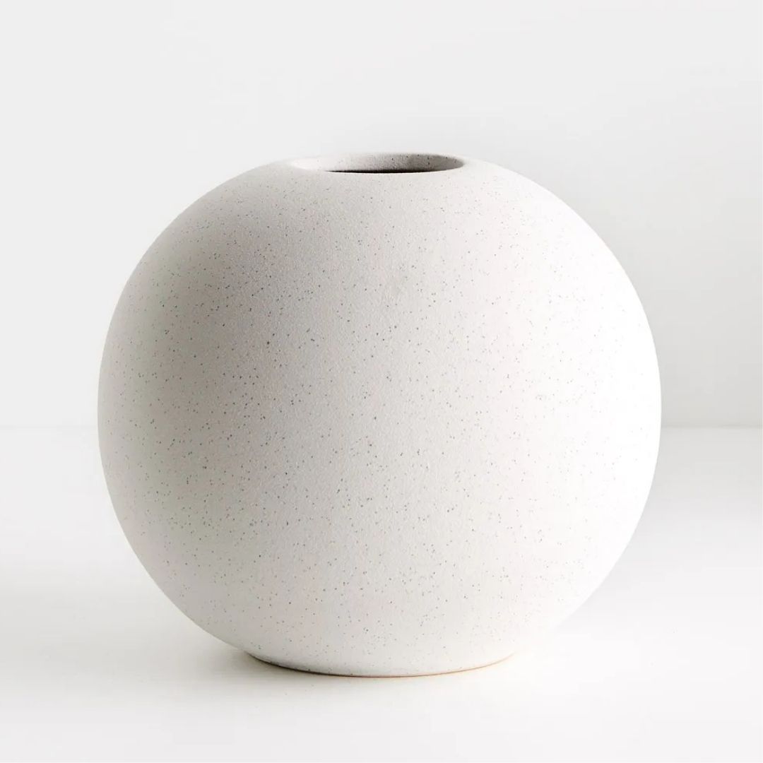 Add bold simplicity to your décor with the Vase Paris Sphere in White. Featuring a textured spherical shape and white finish, this compact vase creates a modern and sculptural statement. Perfect for displaying single stems, small floral arrangements, or as a standalone decorative piece, it brings striking contrast and contemporary style to shelves, tables, and styled displays.